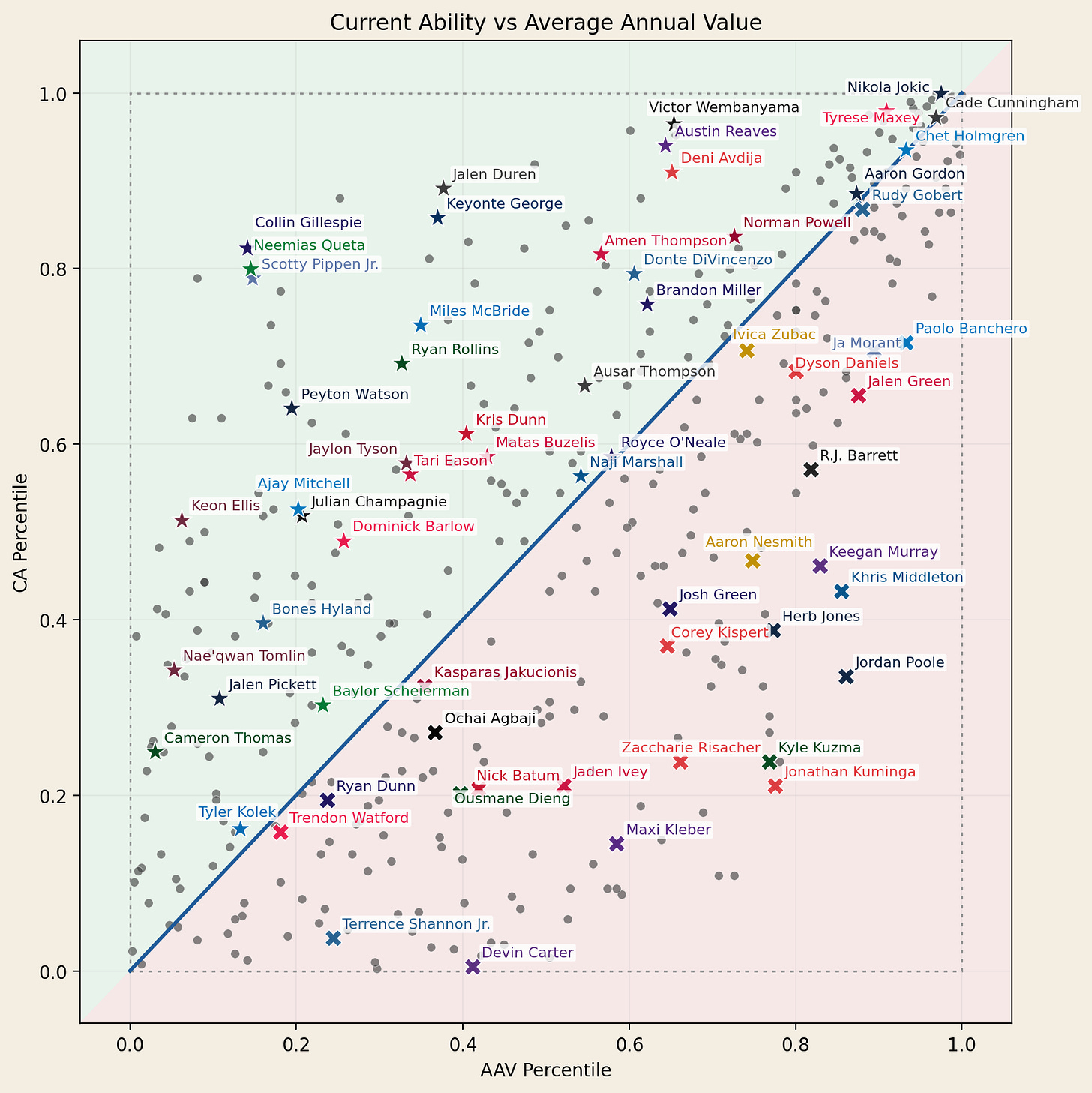 Still, this isn’t the Premier League. Teams can’t simply spend their way to a title. Instead, success depends on how well teams maximize the value of their payroll. Having recently created Current Ability (CA), a player rating metric, I figured why not use it to evaluate contract value. The idea is simple: compare a player’s current on‑court value to what their Average Annual Value (AAV) implies they should be worth.